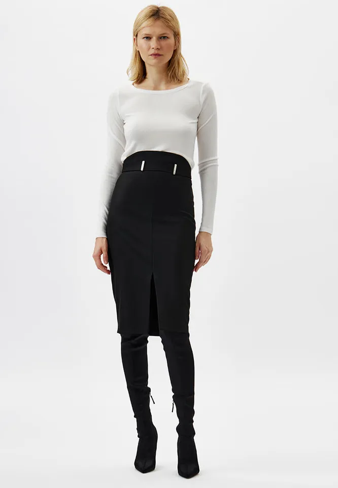 Вечная классика – черная юбка-карандаш с высокой посадкой длиной до колена. Будет круто смотреться с воздушной блузой из органзы, строгой голубой рубашкой, шерстяным джемпером или пуловером. Что касается обуви, то создать модный образ с этой юбкой-карандаш помогут замшевые ботфорты-чулки или высокие сапоги с эластичным присборенным голенищем.