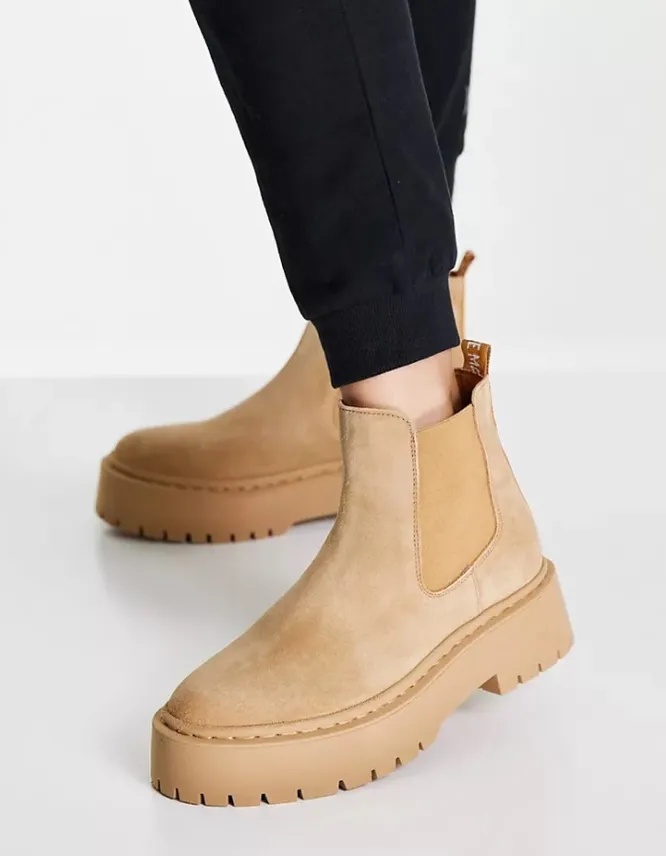 Если ищешь что-то нейтральное и базовое, выбирай песочные женские ботинки челси на грубой подошве из натуральной замши. Они идеально дополнят уютный зимний аутфит с трикотажными штанами и оверсайз-джемпером на молнии, а также легко впишутся в деловой ансамбль с классическими брюками и удлиненным блейзером.