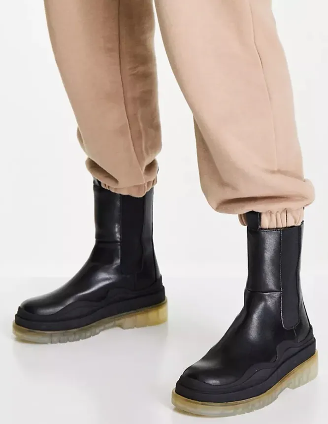Грубые ботинки челси на прозрачной подошве помогут облегчить аутфит. Мы выбрали пару черного цвета из натуральной кожи. Ботинки круто смотрятся с длинными платьями в цветочек, любыми джинсами и свитерами, повседневными и деловыми брюками. Что касается верхней одежды, то эта пара гармонично сочетается с дутыми куртками, пуховиками, оверсайз-пальто и укороченными дубленками.