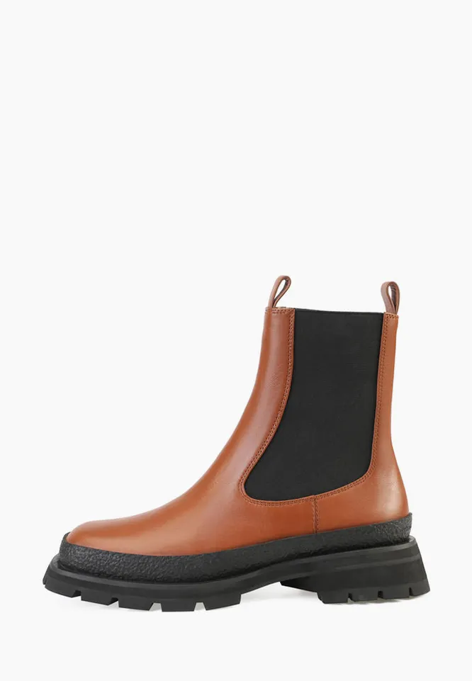 Максимально универсальной парой обуви на зиму станут коричневые ботинки челси на грубой подошве. Мы подобрали для тебя модель модного карамельного цвета с черными боковыми вставками и подошвой. Пара выполнена из натуральной кожи и имеет подошву с глубоким рисунком протектора, которая обеспечит хорошее сцепление со скользкими поверхностями. Носи ботинки с объемными куртками и пуховиками, классическими пальто и дерзкими дубленками-авиаторами, меховыми пальто и кожаными куртками.