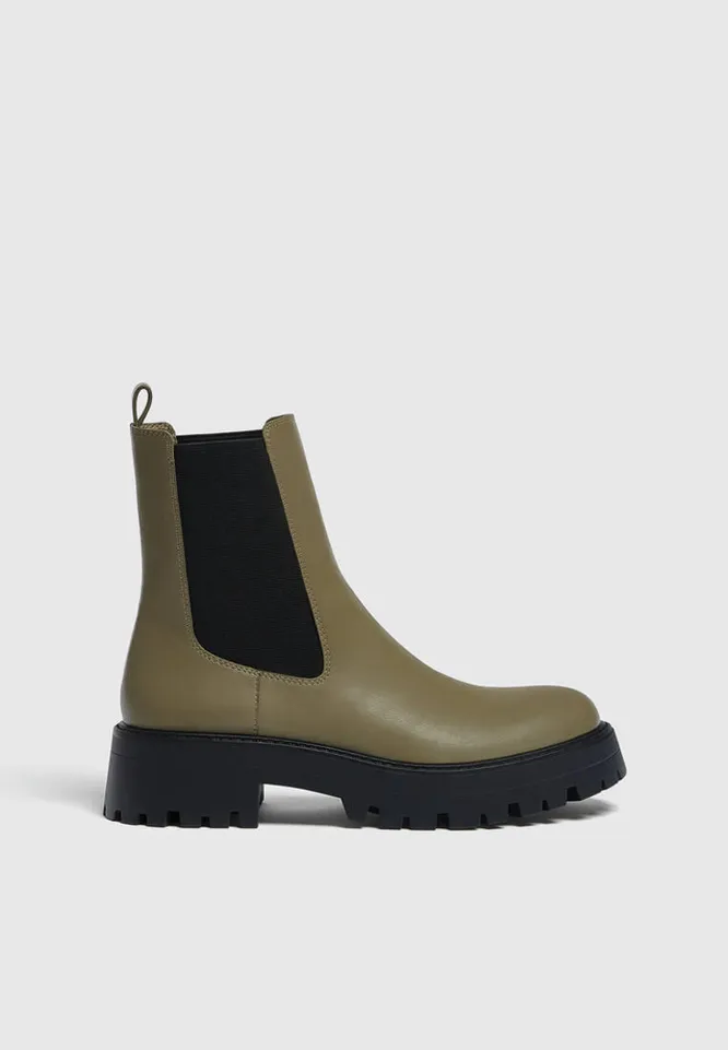 Хаки – один из трендовых цветов зимы, который не выходит из моды уже несколько сезонов подряд. Женские ботинки челси цвета хаки на грубой подошве станут универсальной парой обуви на любой случай. Можно надеть их с кожаными брюками-бананами и узорчатым свитером с объемными плечами, с женственными платьем и удлиненным пиджаком мужского кроя или с темным трикотажным костюмом из оверсайз-худи и джоггеров.