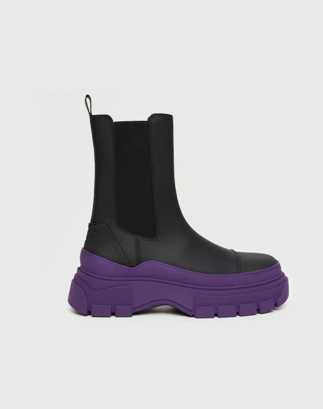 Один из последних трендов – женские грубые ботинки челси на цветной подошве. Такая обувь – отличный способ разнообразить зимний аутфит, добавить ему изюминку. Наш фаворит – черные ботинки на фиолетовой подошве, которую можно поддержать сумкой, шарфом или шапкой в тон. Так ты получишь интересный лук с грамотно расставленными акцентами. Также такие ботинки органично смотрятся в составе монохромных образов в черных тонах.