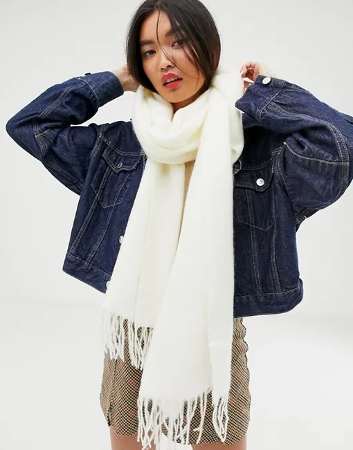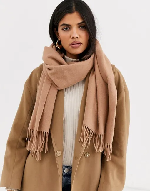 Начнем с классики — теплый шарф бежевой расцветки прекрасно впишется в любой наряд, будь то total-look с пальто и брюками классического кроя или же наряд с дубленкой-авиатором, джинсами-skinny и остроносыми казаками. Если ты ищешь что-то универсальное на эту зиму, то тебе точно стоит остановить взгляд на выбранной нами модели.