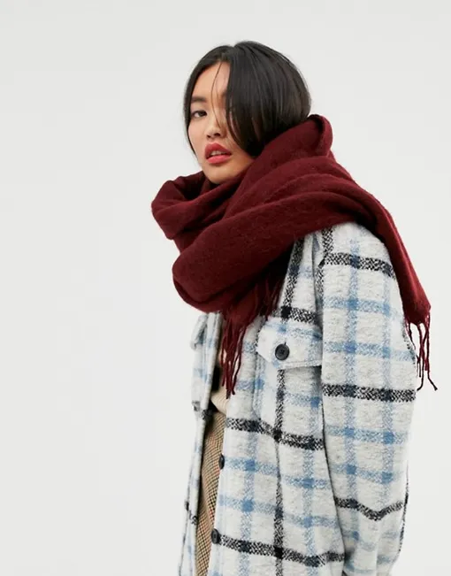 Носим этот шарф, небрежно обернув его несколько раз вокруг шеи. Отличный вариант для оверсайз-образов, в которые мы так любим облачаться зимой. Отдельное внимание стоит уделить расцветке — благородный, винный оттенок как никогда актуален в холода.