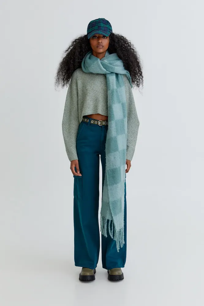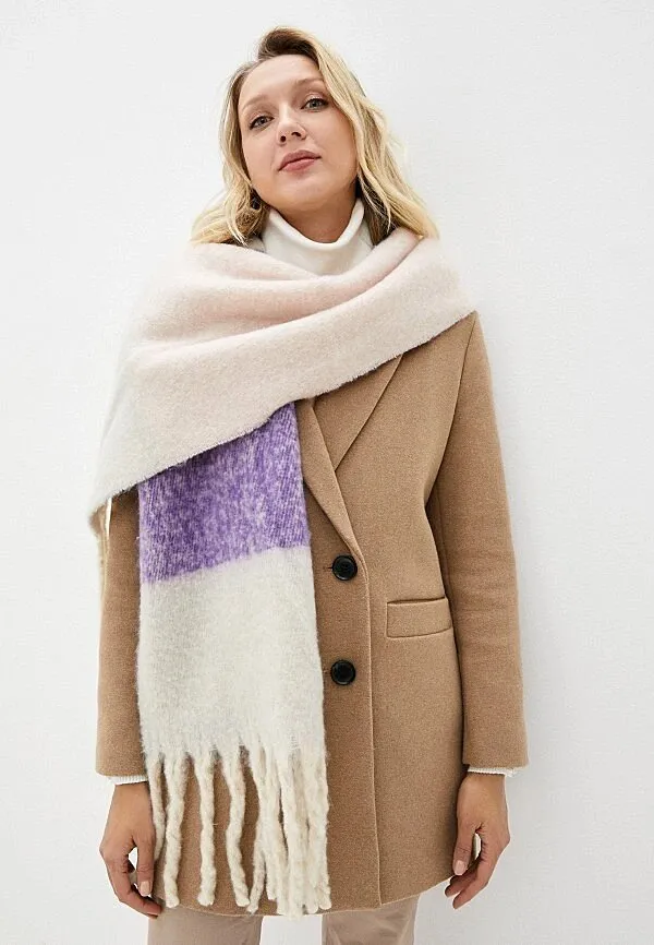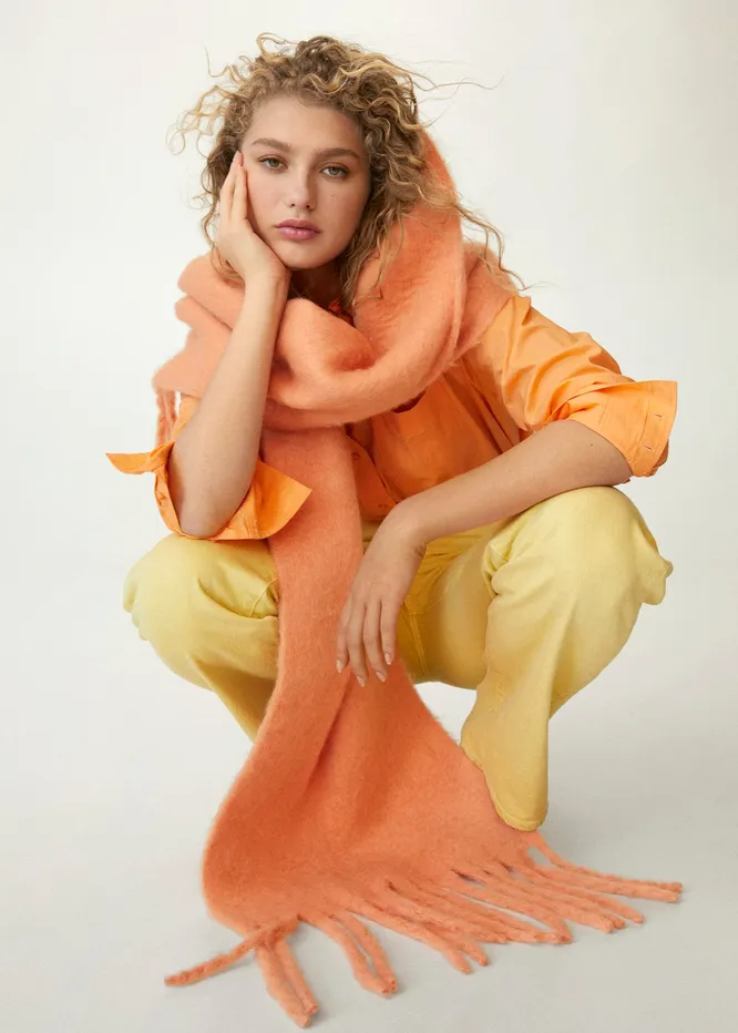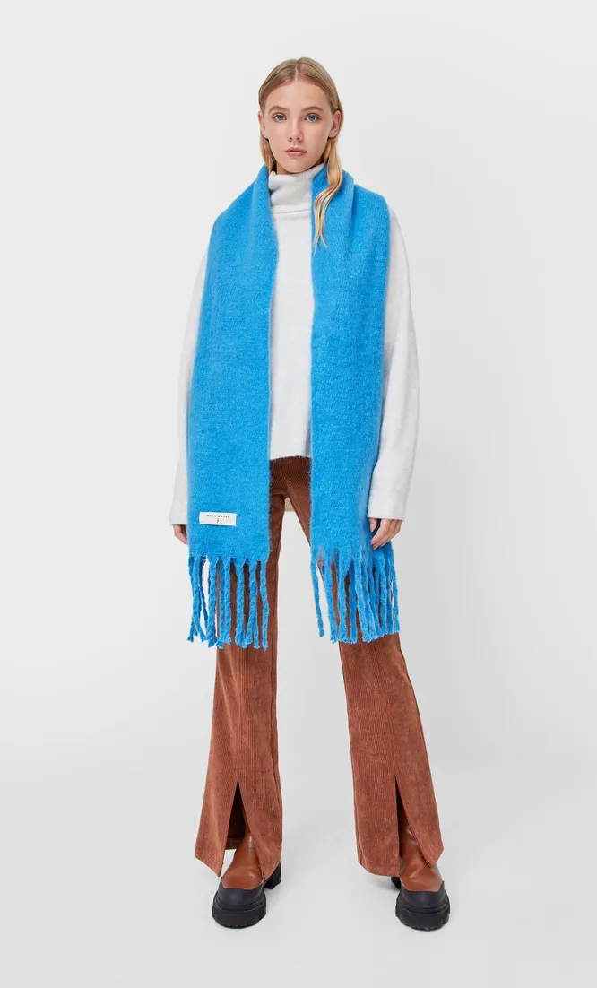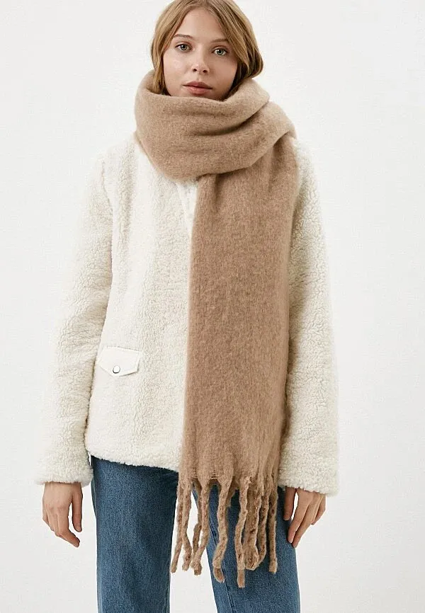 Длинный плотный шарф с бахромой дарит тепло и уют. На фоне объемных пальто и курток массивный аксессуар смотрится пропорционально и визуально компенсирует габариты зимней одежды. Ты можешь подобрать его в тон или сделать ставку на модель яркого цвета, тем самым добавив дополнительный акцент в образ.