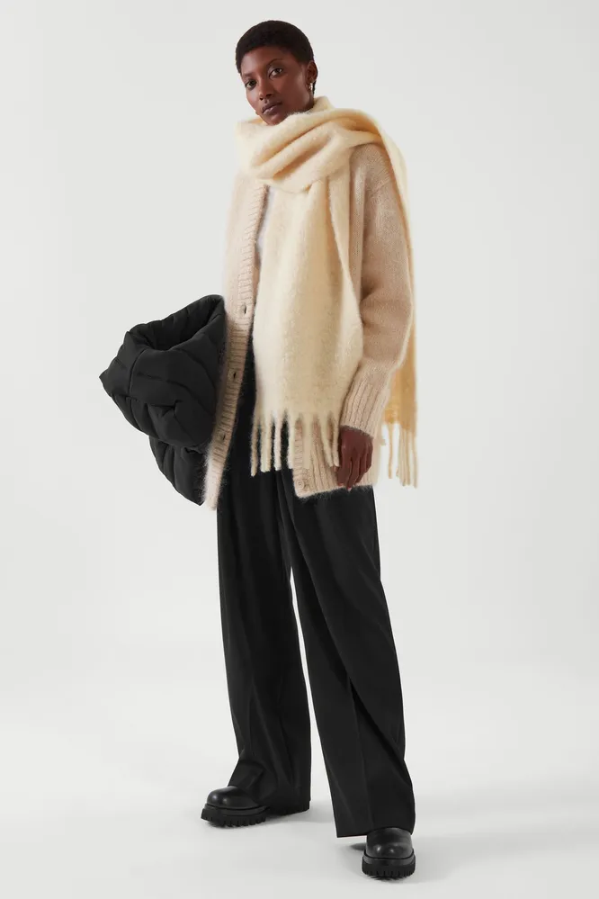 Важное правило: массивный шарф нельзя туго завязывать. Напротив, свободно обмотай его вокруг шеи один раз, а концы оставь свисать. Ты можешь оба конца оставить спереди или добавить немного асимметрии в образ и один край перекинуть назад. Необязательно, чтобы оба конца были равномерной длины — один может быть длиннее, другой — короче. Так еще интереснее!