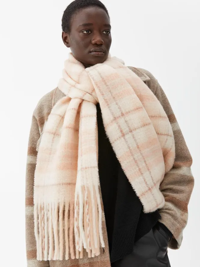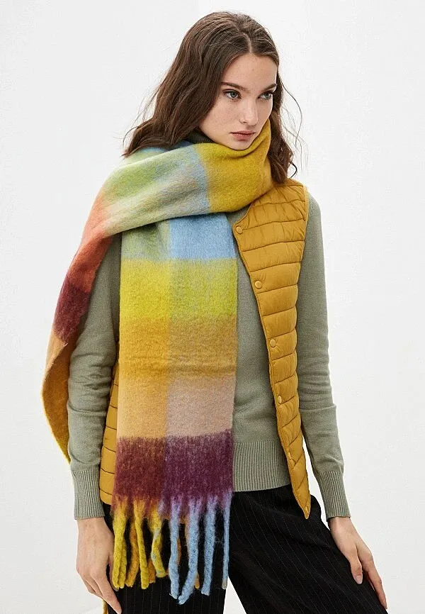 Ярко и необычно смотрятся клетчатые шарфы с длинной бахромой. Они могут как выделяться на фоне остальной одежды, так и быть подобраны в тон ей.