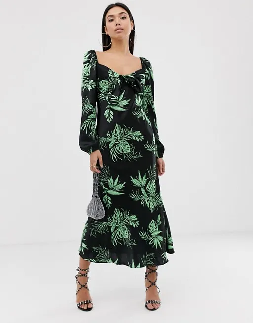 С наступлением тепла начинай носить одежду с тропическим принтом, причем не только на курорте, но и в пределах города. Для пляжа выбирай варианты поярче, а на каждый день — что-то более сдержанное. Отличный пример — черное платье-макси с изображением листьев тропических растений. Глубокий вырез сердечком, пышные рукава, актуальные в этом году, и завязка на груди — такая комбинация идеально подойдет как для романтической прогулки, так и для ужина в ресторане.