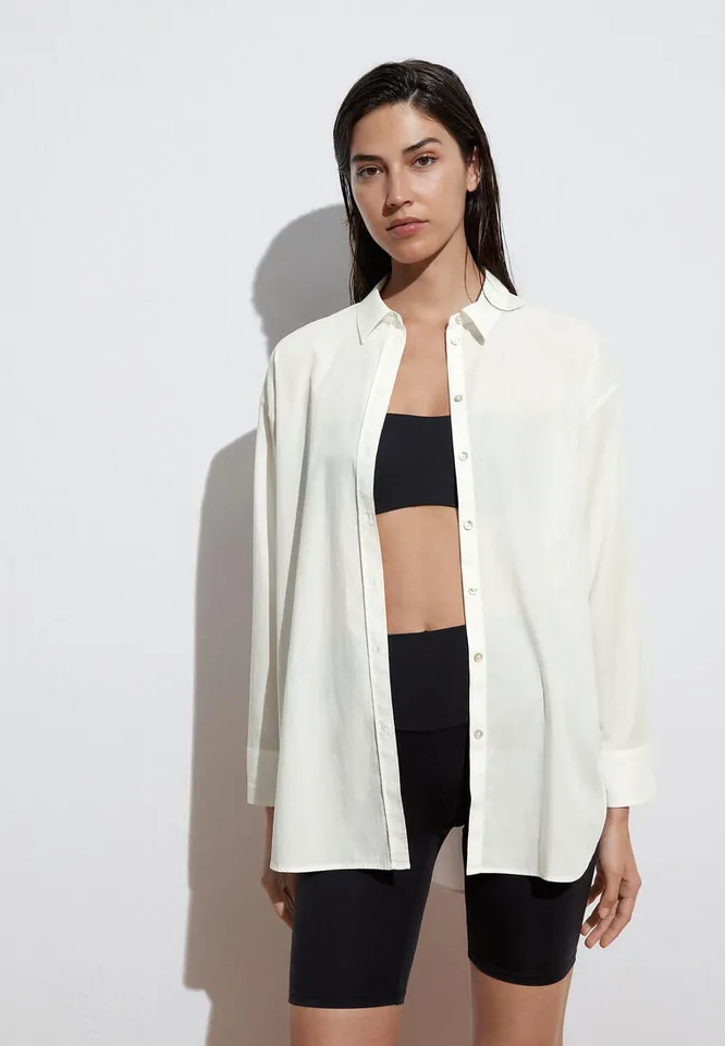 Удлиненная оверсайз-рубашка – отличная замена пиджакам и курткам прохладными летними вечерами. Она органично смотрится поверх летних сарафанов, платьев, топов с шортами, велосипедками или джинсами. Рукава можно небрежно завернуть, а концы рубашки завязать модным узлом.