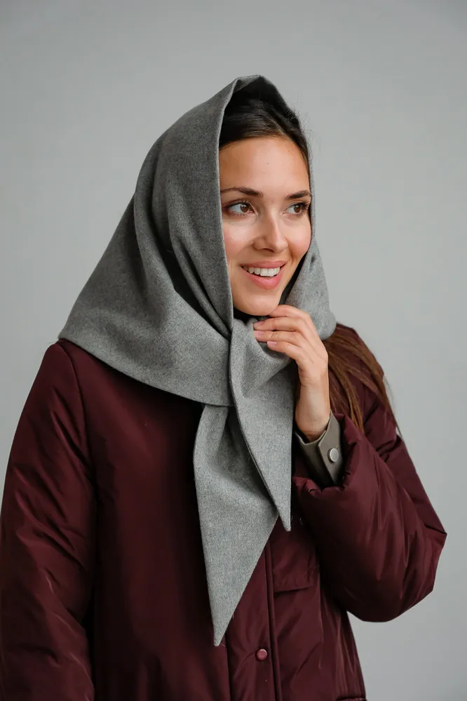 Серая утепленная косынка из шерсти быстро «подружится» и со спортивными пуховиками, и с элегантными пальто.
