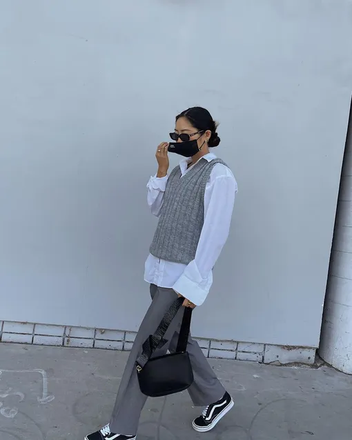 А вот универсальная модель, которая легко впишется в разные образы. Например, можно комбинировать ее с футболкой или casual-рубашкой, джинсами и светлыми кроссовками – получишь стильный комфортный лук на каждый день. В офис носи ее с блузкой и юбкой А-силуэта или используй как базу под брючный костюм. Базовый серый жилет также станет хорошим дополнением к ансамблю с трикотажными джоггерами и свитшотом.