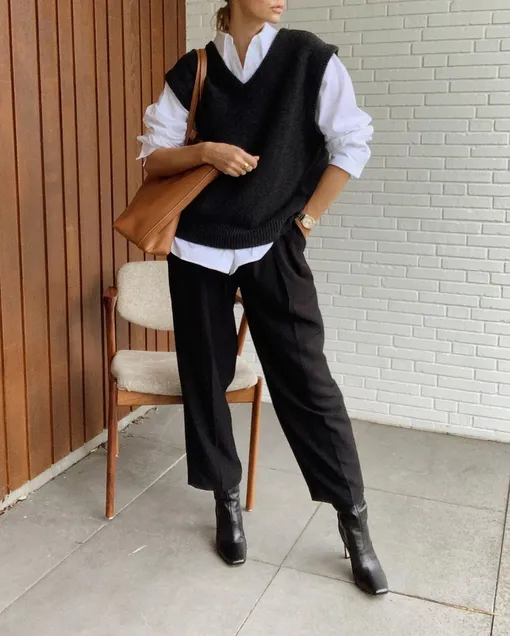 Для создания делового или элегантного образа отлично подойдет черный вязаныйя жилет. Комбинируй ее с белой рубашкой прямого кроя и классическими брюками со стрелками. Из аксессуаров выбирай сумку с жестким каркасом, торбу или сэтчел, а из обуви – остроносые ботильоны на каблуке-рюмочке, закрытые туфли или лоферы. Пара изящных украшений и лаконичные наручные часы тоже не будут лишними.
