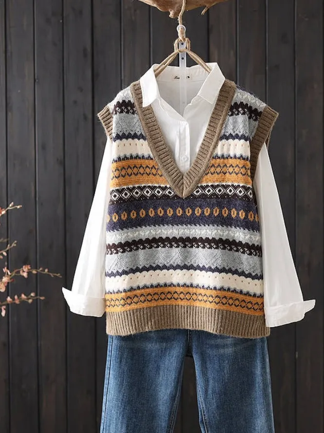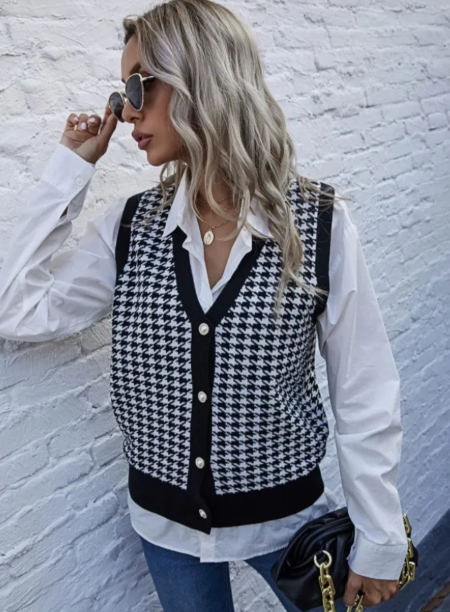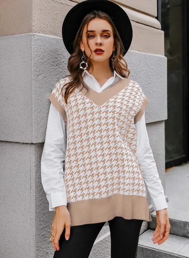 Еще один модный вязаный жилет для женщин – модель с V-образным вырезом и принтом «гусиная лапка». Она органично впишется в деловые луки с классическими рубашками и строгими брюками со стрелками. В повседневной жизни ее можно носить поверх базовых лонгсливов с джинсами или уютными джоггерами и ботинками на шнуровке. Для создания романтичного лука дополни жилет блузкой с бантом на воротнике и плиссированной юбкой миди.