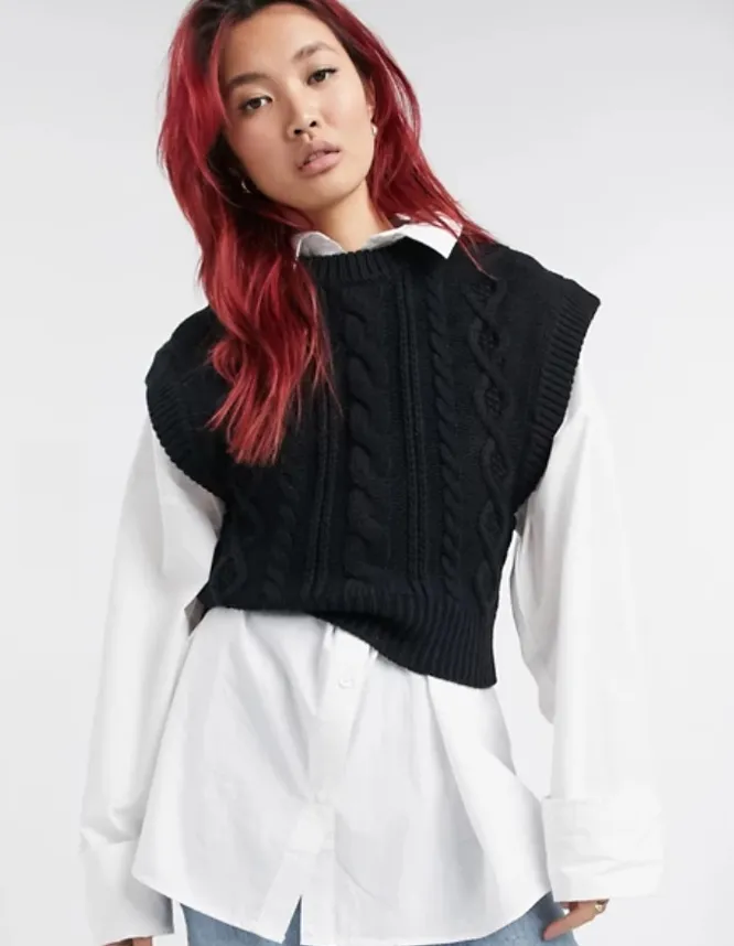 Помимо укороченных жакетов в списке трендов можно найти короткие вязаные жилеты. Чтобы визуально удлинить ноги и гармонизировать пропорции фигуры, советуем комбинировать такой жилет с низом на высокой посадке. Это могут быть брюки-бананы, джинсы в винтажном стиле или юбка-карандаш. Как базу под жилет выбирай объемную рубашку, свободную футболку или носи его на голое тело.
