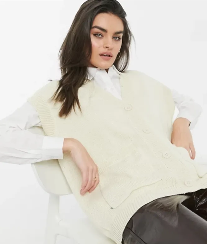 Удачная альтернатива кардигану – белый вязаный жилет на пуговицах. Его можно надеть поверх трикотажного или любого другого платья и подвязать поясом, чтобы акцентировать внимание на талии. Он гармонично впишется и в образ с оверсайз-рубашкой, кожаными легинсами и высокими грубыми ботинками – получишь стильный повседневный лук.