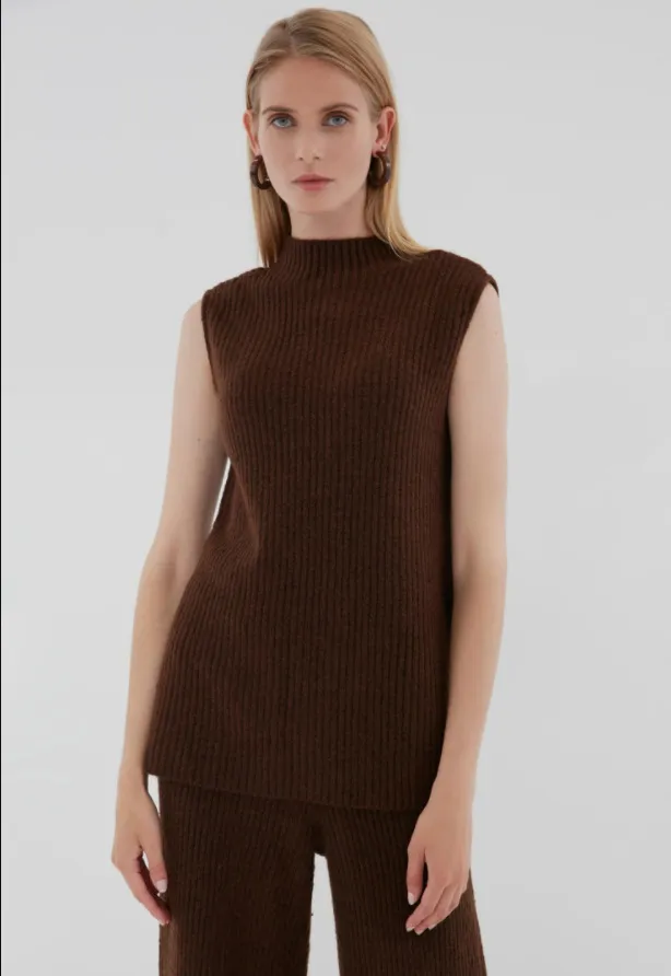 Наш первый фаворит – стильный вязаный жилет с высоким горлом и разрезами по бокам. Он хорошо сочетается со свитшотом, плотной рубашкой, шелковой и шифоновой блузкой. Чтобы сбалансировать объемный верх, носи такой жилет с узкими джинсами и брюками, юбками и платьями полуприлегающего кроя. Тем, кто любит комбинировать объемные вещи, предлагаем носить его с широкими штанами и оверсайз-рубашками.