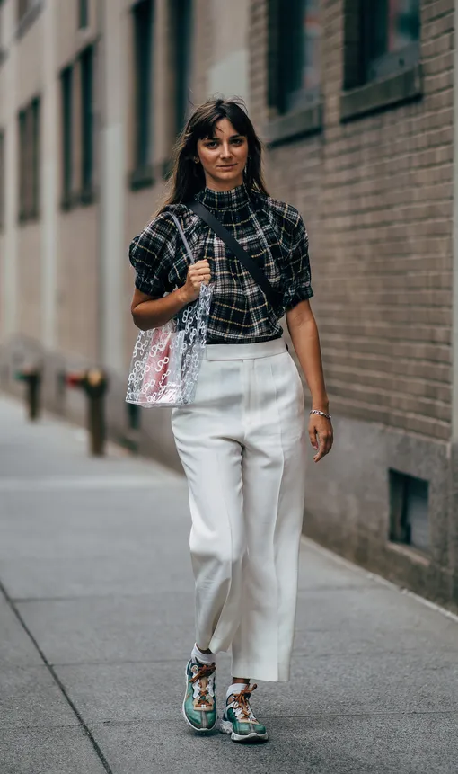 Максимально широкие брюки будут эффектно смотреться с кроссовками и клетчатой рубашкой или топом. Причем можно выбрать как ugly shoes (обувь в этой стилистике до сих пор актуальна), так и лаконичную спортивную пару на тонкой подошве. Стильным аксессуаром станет прозрачная сумка-шопер и дождевик на случай плохой погоды.