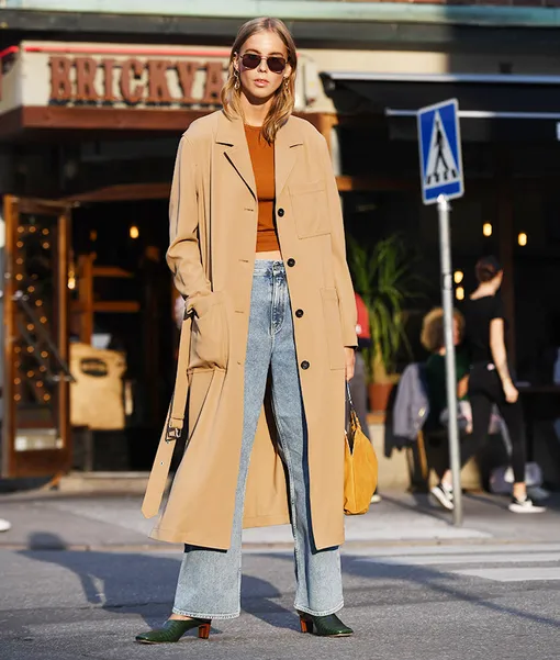 Если тебе по душе широкие брюки из денима, выбирай слегка укороченную модель и носи ее в начале осени с футболкой и мюли, а в конце — с кашемировой водолазкой и брутальными ботинками. Чтобы не замерзнуть, накинь на плечи бежевый объемный тренч или парку.