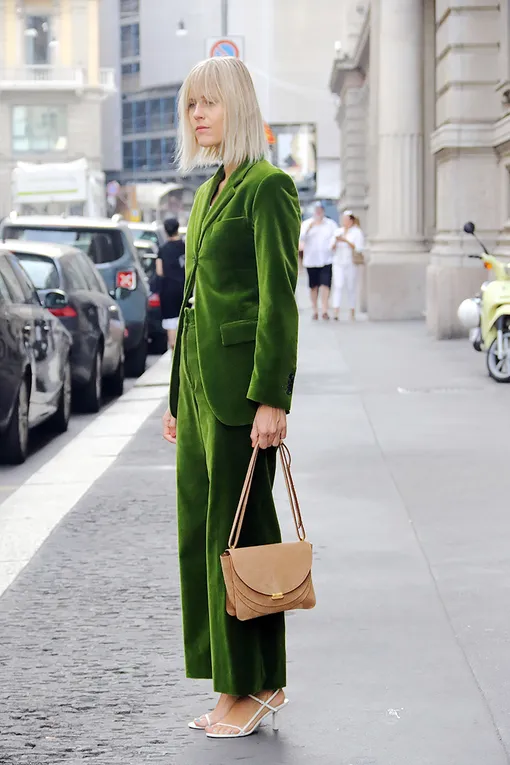 Если тебе нравятся расслабленные аутфиты, то стоит надеть свободные бархатные брюки и удлиненный жакет в тон, довершив образ небольшой сумкой из мягкого материала и туфлями-лодочками. В таком наряде можно отправиться хоть на прогулку по городу, хоть на веселую вечеринку.