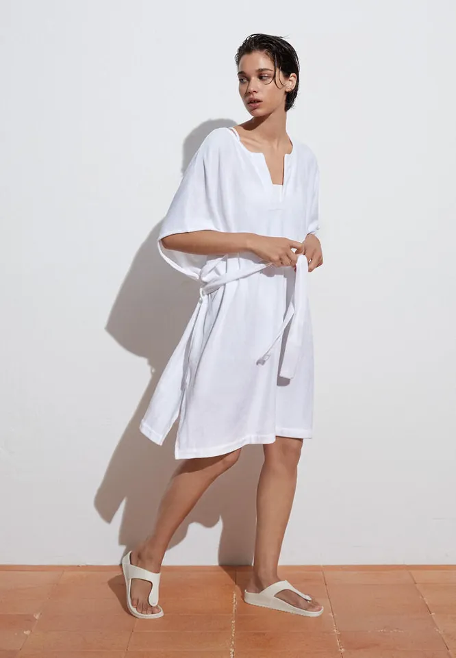 Свободное белое платье рубашечного кроя органично смотрится с любым купальником. Можно дополнить ее широкополой шляпой и кожаными шлепанцами.