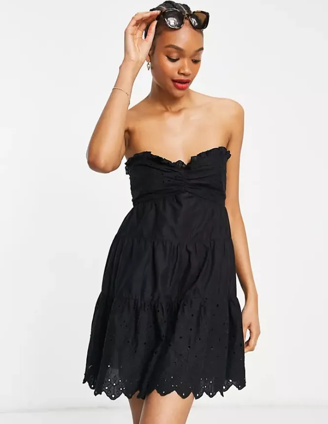 Платье-бандо с вышивкой бродери поможет создать стильный образ для пляжной вечеринки.