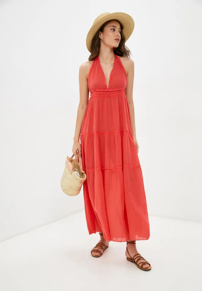 Яркое коралловое платье макси с воротником халтер точно не оставит тебя без внимания!