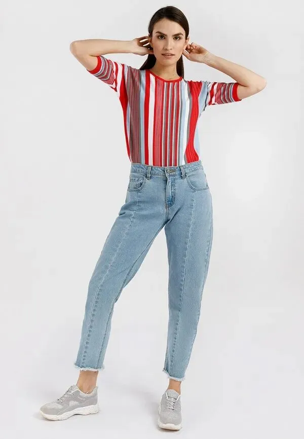 Джемпер с приталенным силуэтом и укороченными рукавами рекомендуем носить с однотонными вещами вроде прямых джинсов и кроссовок. Так ты точно не перегрузишь образ.