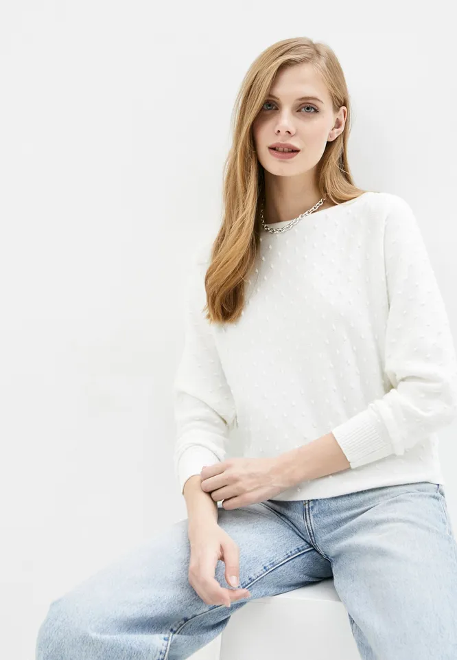 Нежный белый джемпер украшен необычной текстурой, которая издалека напоминает мелкие жемчужины.