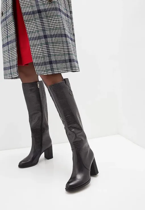 Для тех, кто предпочитает «высоту», мы подобрали модель на блочном каблуке, который обеспечит отличную стойкость на дороге. Стоит также отметить свободную посадку в области голенища, благодаря которой ногам будет легко и комфортно на протяжении дня. Сапоги выполнены из натуральной кожи с тиснением под рептилию и утеплены байкой — они отлично греют и подходят даже на очень холодную погоду.