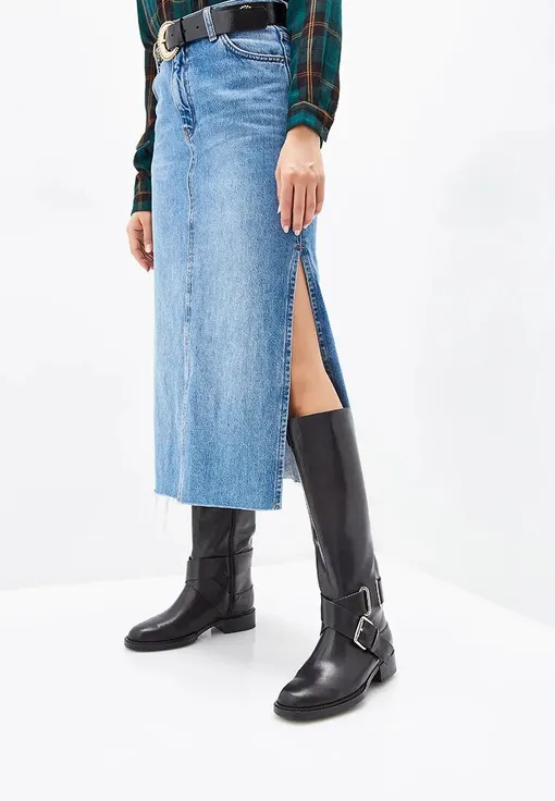 Предлагаем тебе сыграть на контрасте и подобрать к этим строгим, слегка грубоватым сапогами стильную юбку-миди из плотного материала. Обрати внимание на модели из мягкого трикотажа или денима.