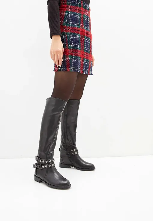 С такими сапогами твой образ заиграет с новой силой: скрещенные ремешки, украшенные серебристыми клепками, придают модели рок-н-ролльный вид. Носить их можно как с узкими джинсами, заправив штанины внутрь, так и завышенной мини-юбкой, дополнив образ объемным, мягким свитером.