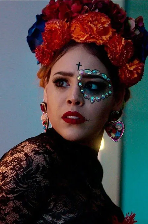 В образе, вдохновленном Фридой Кало, Лукреция появилась на вечеринке по случаю Хеллоуина. И хоть идея уже достаточно избитая, костюмерам удалось выжать из нее максимум и подать образ совершенно по-новому. На ней шикарное черное платье из тонкого кружева, а на голове — пышный венок из цветов и платок, вплетенный в косу.