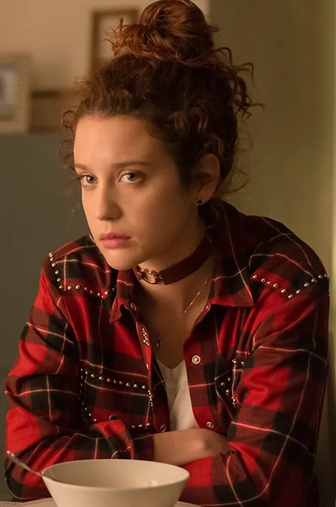 Даже самые простые наряды не обходятся без декора. Здесь, например, клетчатая рубашка, украшенная металлическими заклепками. В сочетании с чокером и ярким принтом они делают образ Марины дерзким, бунтарским, в очередной раз подчеркивая независимый характер героини.