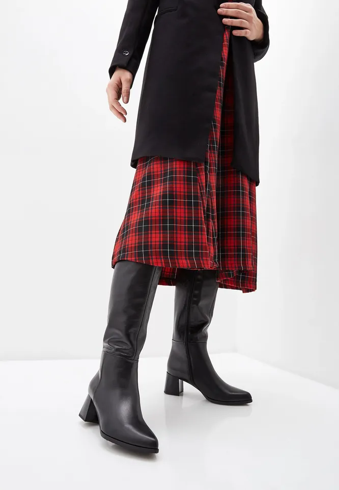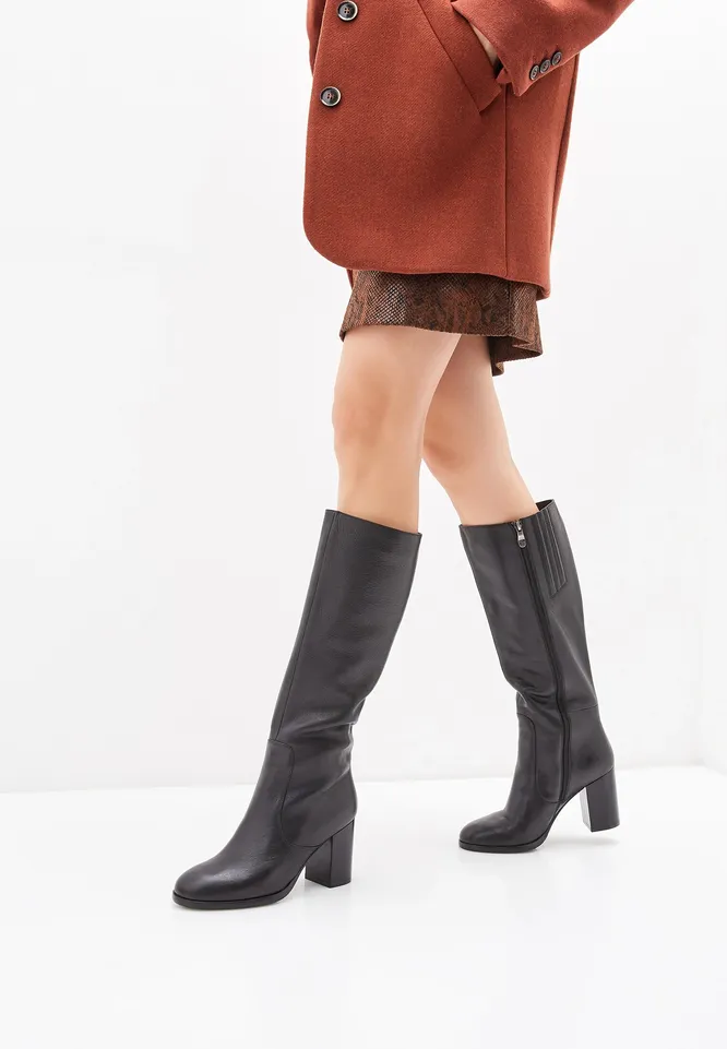 Высокие сапоги-трубы — актуальный вариант на эту зиму. Они свободно сидят на ноге, не обтягивая голень, при этом, благодаря качественному кожаному материалу, отлично держат форму. Каблук-кирпичик не доставит тебе дискомфорта и даже, напротив, обеспечит правильное расположение стопы в обуви.