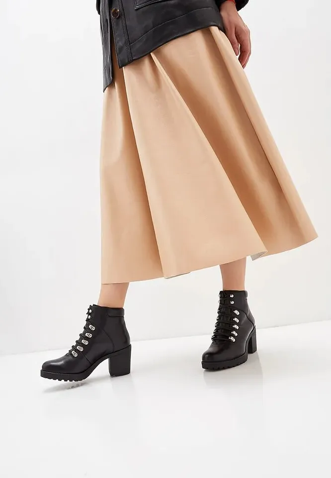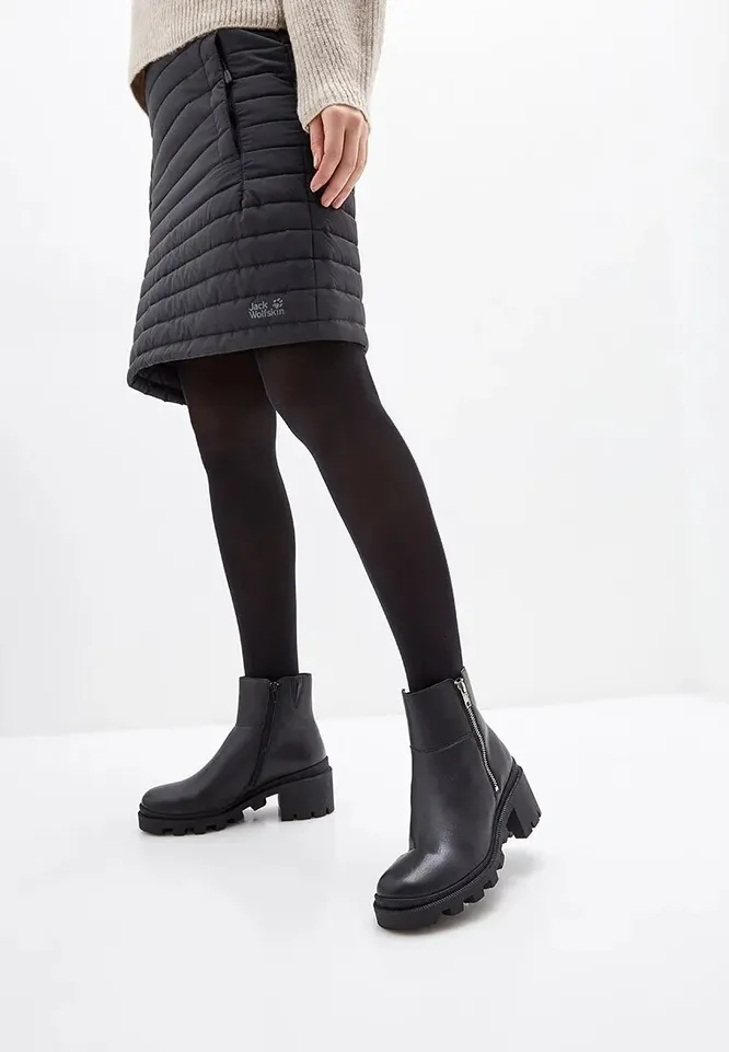 Если для образа нужно что-то не слишком высокое, лучшим вариантом станут ботильоны. Многие бренды выпускают их в утепленном формате. Выбранная нами модель хороша тем, что плотно сидит на ноге за счет шнуровки — это позволяет зафиксировать стопу и не дать ей «гулять» по обуви. Тракторная подошва поможет тебе удержаться на ногах в скользкую погоду, а также защитит от промокания.
