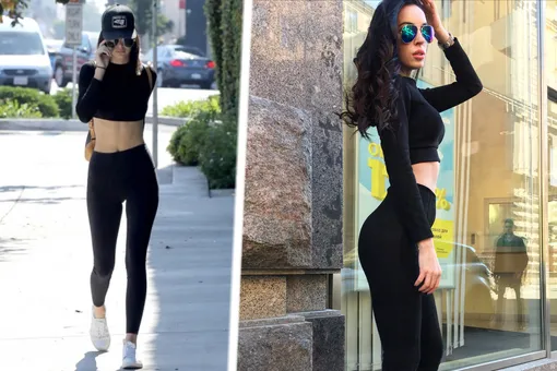 Малышка Кендалл Дженнер непринужденно разгуливает по улицам в черном костюме с верхом кроп-топ. Очки, кепка и кеды дополняют повседневный образ. Кто сказал, что вы не сможете так же? Костюм многофункционален: если с кепкой и кедами — то гулять в парк с собакой, а если с локонами и каблуками —тусоваться ночь напролет.