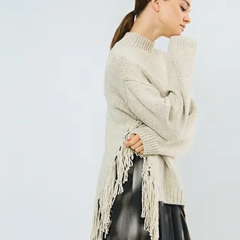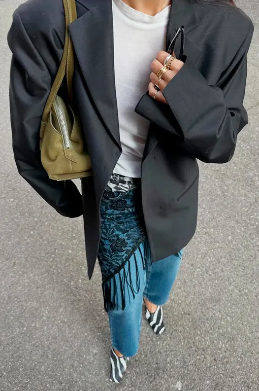 Например, если выбираешь юбку с бахромой, верх к ней берем минималистичный и спокойный: базовый топ, рубашку или лонгслив. Надеваешь жакет с бахромой — оставляй низ «чистым»: прямые брюки, джинсы, лаконичная юбка подойдут.