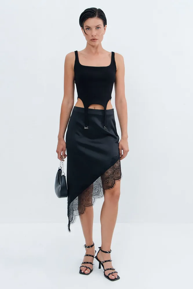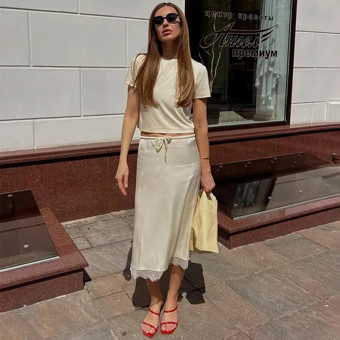 В прошлом году фэшн-инфлюэнсеры носили сразу по два лонгслива – один поверх другого. Это все еще валидный трюк, но в образах с атласными юбками его лучше не применять. Кружево на подоле – само по себе заметная деталь, не стоит отвлекать от нее внимание. Одного лонгслива, тонких кожаных вьетнамок / сандалий и минималистичного кулона будет достаточно.