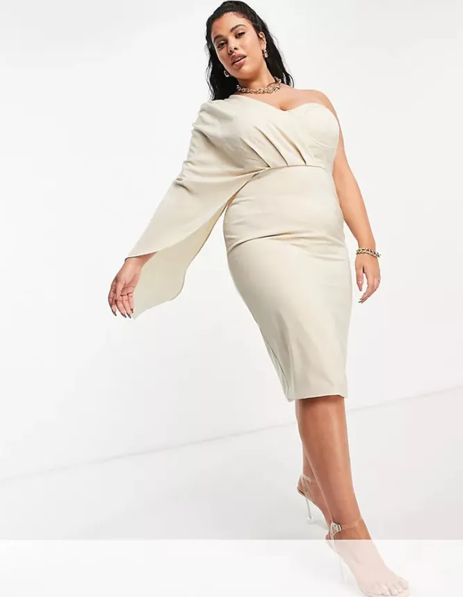 Если не знаешь, какое вечернее платье для полных купить, обрати внимание на интересную модель на одно плечо, скроенную по фигуре. К нему подойдут разные аксессуары: от жемчужных сережек до массивных цепей. Платье красиво обрамляет фигуру, визуально удлиняет шею и подчеркивает зону декольте. Из обуви выбирай классические лодочки, балетки на невысоком блочном каблуке, нейтральные босоножки.