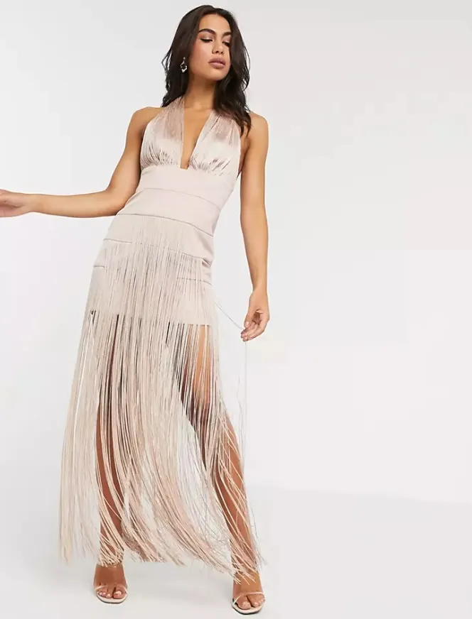 Хочется чего-то необычного? Тогда стоит купить эксклюзивное вечернее платье с юбкой в виде длинной бахромы. Модель подойдет как для коктейльных вечеринок, так и для свадебных торжеств. Сочетай его с атласными туфлями, украшенными пряжкой из стразов, лаконичным клатчем и длинными серьгами. Бахрома добавит образу динамичности и шика.