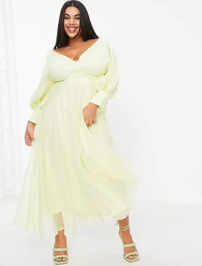 Летящее платье миди из органзы с пышными рукавами выгодно подчеркнет бюст и скроет недостатки в области живота и бедер. Дополняй его светлыми туфлями или босоножками на каблуке, небольшой сумкой с короткими ручками. Можно добавить изящный кулон на тонкой цепочке.