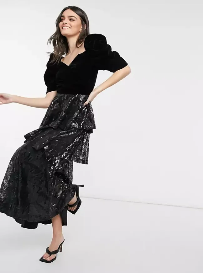 Для модной коктейльной вечеринки можно купить дизайнерское вечернее платье с бархатным верхом и блестящей ярусной юбкой. Вырез сердечком визуально удлинит шею и подчеркнет зону декольте. Советуем надеть массивное многослойное ожерелье или крупный кулон. Что до аксессуаров, то это платье органично дополнят жемчужные серьги, блестящий клатч и классические черные лодочки из лаковой кожи.