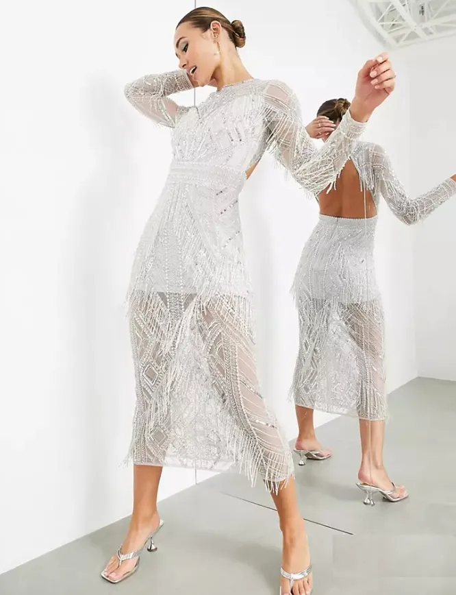 Если хочешь блистать и быть звездой вечеринки, выбирай серебристое платье с блестящей бахромой. Предлагаем поддержать его такими же эффектными туфлями и аксессуарами.