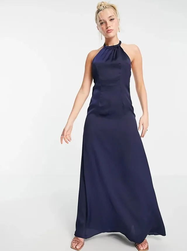 Лаконичное темно-синее платье в пол с воротником халтер в сочетании с массивными мерцающими украшениями создаст роскошный вечерний наряд, в котором можно отправиться и на свадьбу, и на модную вечеринку, и на светское мероприятие. Заверши наряд фактурной сумкой с декором и атласными остроносыми туфлями.