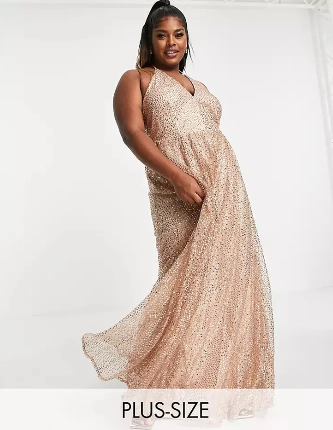 Роскошное платье макси в цвете розовое золото, расшитое пайетками, — идеальный вариант для тех, кто хочет быть звездой вечера. Добавь акцентное ожерелье на шею, пару массивных браслетов и атласный клатч.