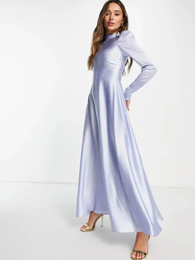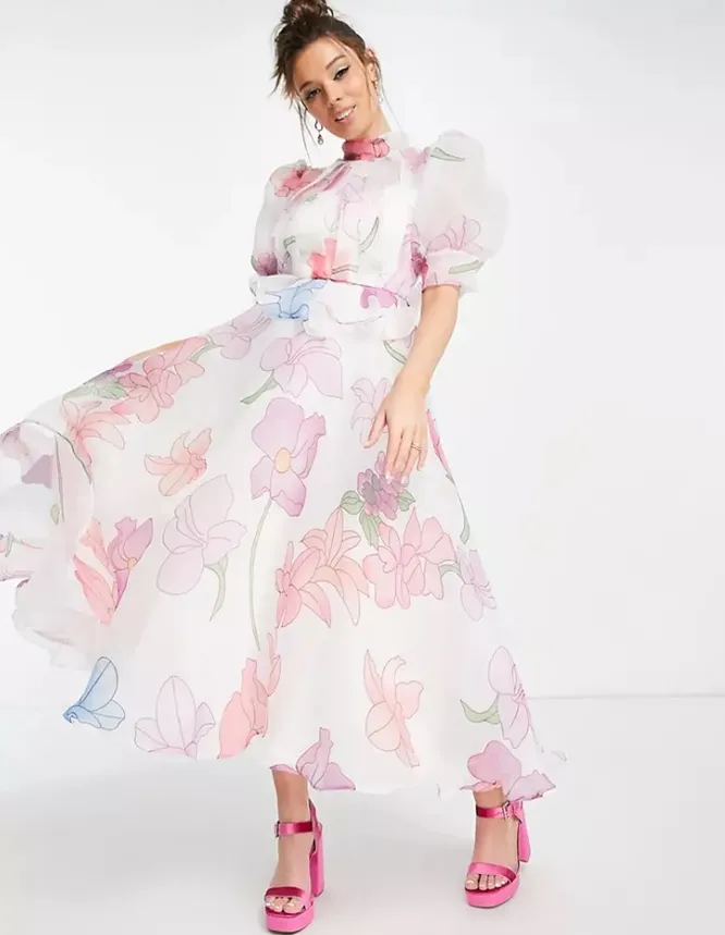 Если ищешь что-то нежное и романтичное, советуем купить длинное вечернее платье из воздушной ткани с объемными рукавами. Пастельные оттенки, акварельный цветочный принт, летящий силуэт, воротник-стойка – эта модель позволит создать красивый образ для торжества. Дополни его блестящими босоножками или классическими белыми лодочками, сделай высокую прическу, добавь серьги-шандельеры и фактурный клатч.