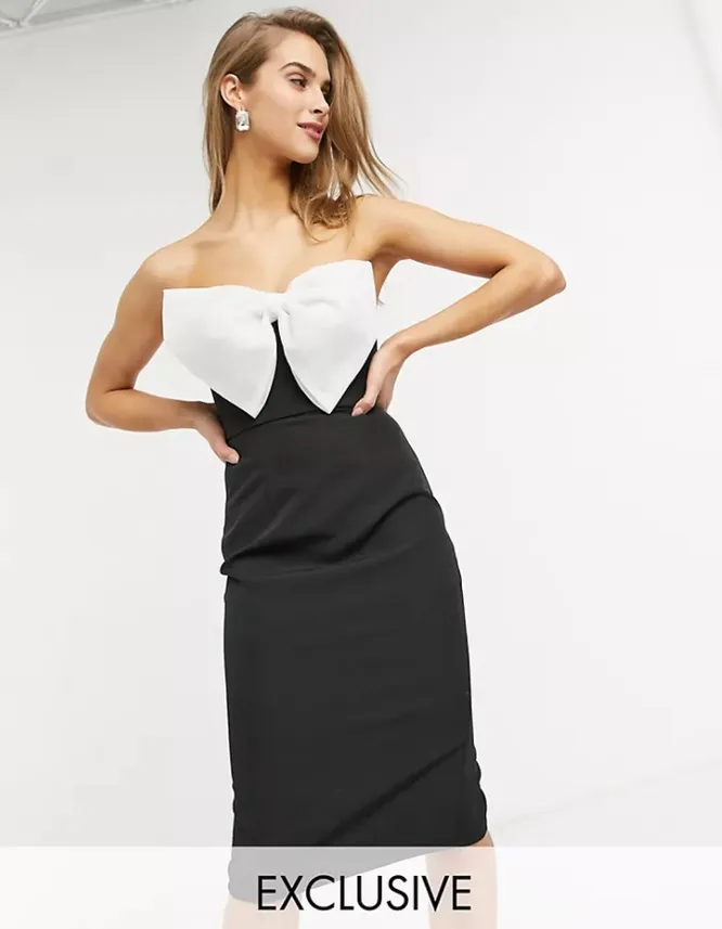 Маленькое черное платье – вечная классика, которая никогда не выйдет из моды. В качестве вечернего варианта идеально черное платье-футляр длины миди с декором в виде большого белого банта на груди. Лучшим дополнением к нему станут классические лодочки или черные босоножки, элегантные серьги и браслеты с жемчугом и атласный клатч продолговатой формы. Поверх можно накинуть твидовый жакет.