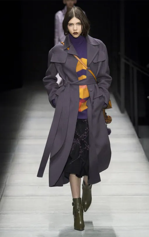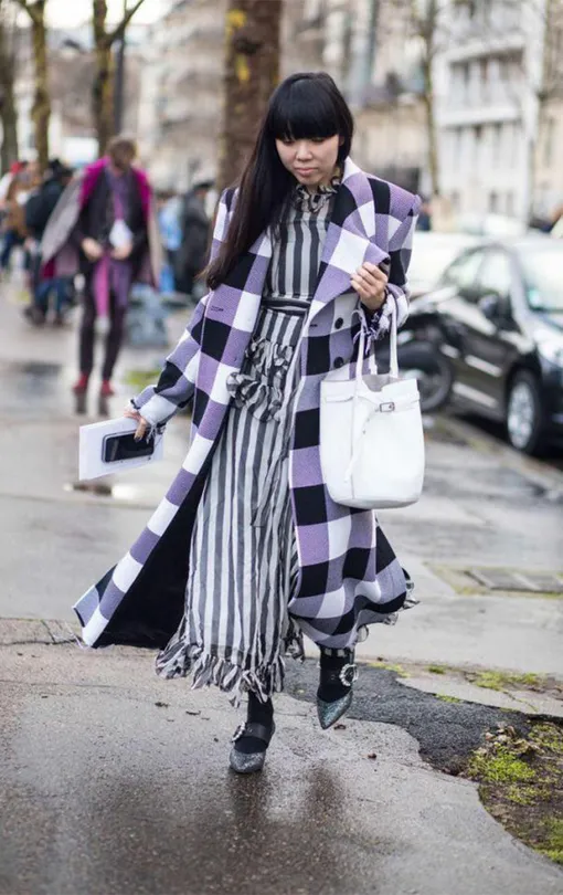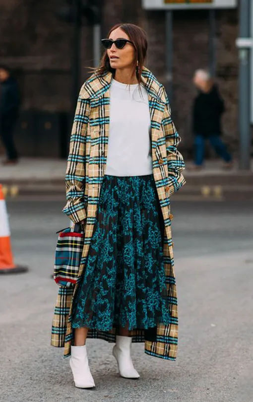 В этом случае фокус в сочетании бирюзового принта на юбке и бирюзовых же полосок на пальто (плюс желтый, который сочетается с бирюзой):