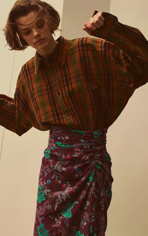 В лукбуке коллекции Isabel Marant pre-fall 2018 тоже близкие оттенки основного цвета (грязно-оранжевый на рубашке и винный на юбке):