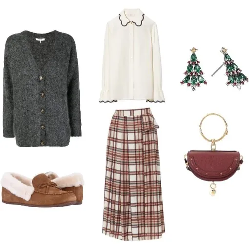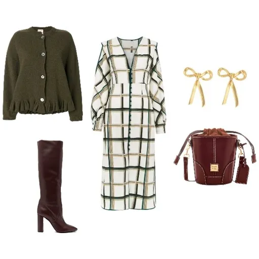 Платье свободного кроя в крупную клетку, женственный кардиган и сережки-бантики – идеальное сочетание для рождественского ужина с родителями. А чтобы не выглядеть совсем уж пай-девочкой, добавь к образу кожаные ботфорты винного цвета (главный маст-хэв сезона) и сумку-торбу.